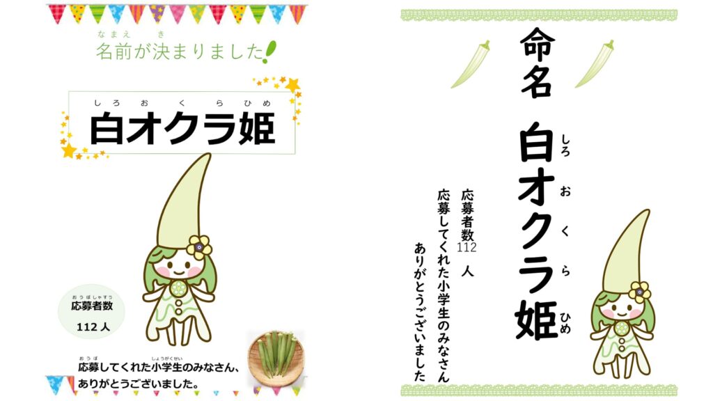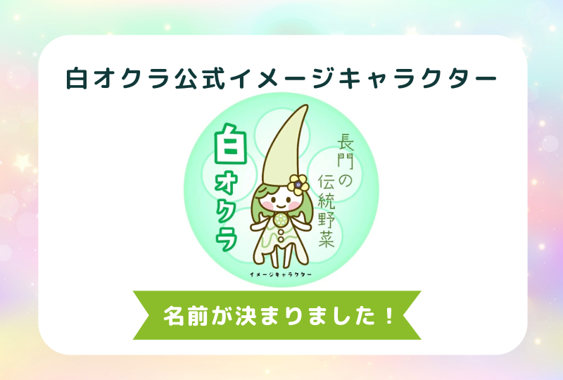 お知らせ 長門市の伝統野菜『白オクラ』キャラクターの名前が決まりました! 2025年9月20日 by info_mg6613hc 白オクラのキャラクター名が決まりました! 長門市の伝統野菜「白オクラ」のキャラクター名が、市内112人の小学生からの応募の中から「白オクラ姫」に決定しました。 命名:「白オクラ姫」 応募者数:112人 応募してくれた小学生のみなさん、ありがとうございました。 「白オクラ姫」命名 公表資料 キャラクター, ご当地キャラ, 伝統野菜, 公表資料, 命名, 地域キャラクター, 小学生応募, 山口県, 応募112人, 白オクラ, 白オクラ姫, 道の駅センザキッチン, 長門市
